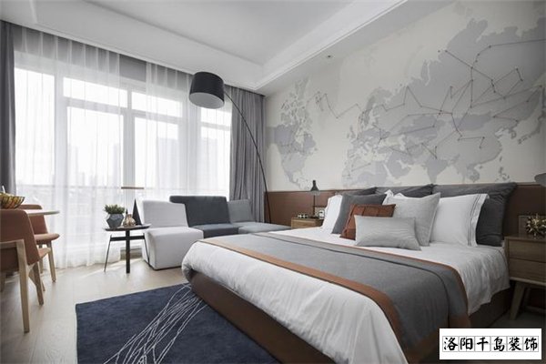 我真是沒(méi)有想到臥室能夠裝修的這么寬敞大氣,主要是格局劃分非常棒,樣板間在裝修的時(shí)候把陽(yáng)臺(tái)與臥室打通,這樣使得空間進(jìn)一步得到了擴(kuò)展,另外在背景墻上采用高級(jí)灰色的格調(diào),上面還有世界地圖的圖案,將臥室映襯的非常宏偉壯觀(guān)。