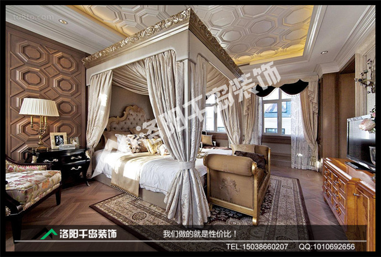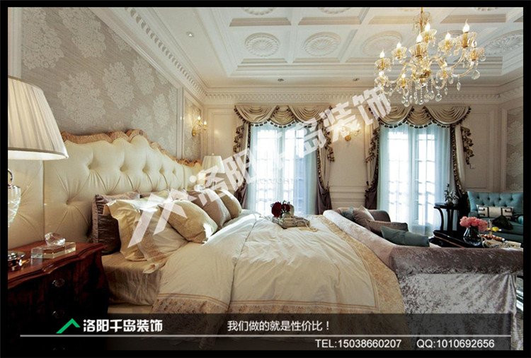 歐式三居室臥室呈現(xiàn)完美的曲線,墻壁和屋頂?shù)牡窕ㄔO(shè)計遙相呼應(yīng),歐式大床更添富貴奢華。