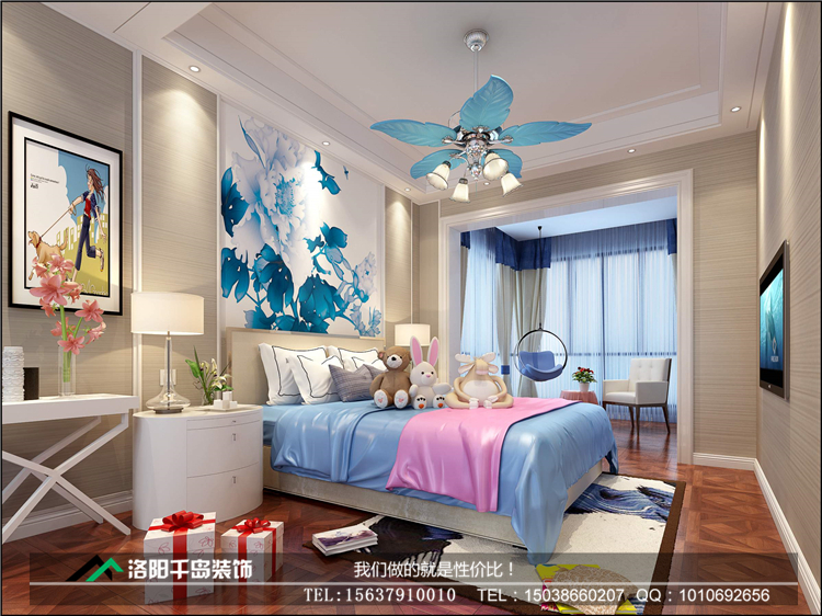 兒童房被設置在了二層。兒童房海藍色與卡通元素的點綴,讓男生的空間充滿了活躍的氣息。洛陽開元名郡225㎡復式新中式裝修案例@二樓兒童房