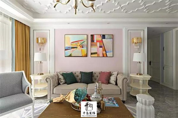 進(jìn)入客廳是淡粉色的墻面,搭配金色的窗簾,以及幾何的裝飾畫,來(lái)點(diǎn)綴空間從而使空間的色調(diào)更加的豐富。