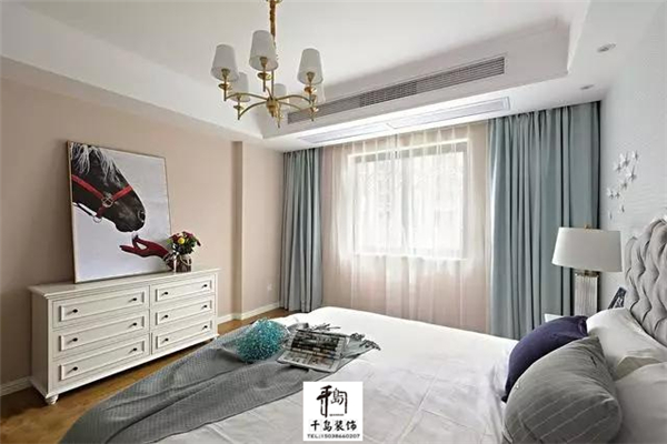 主臥的設(shè)計(jì)繼續(xù)延續(xù)素雅,這樣的睡眠空間更好的入睡。馬頭的裝飾畫為空間營(yíng)造出一份藝術(shù)的氛圍。