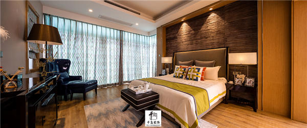 主臥室可以選擇對比圖案并且有絲綢感的窗簾及布藝。其中藍(lán)色造型的布料可以做大面積窗簾使用,那么整個臥室的感覺就是比較奢華,而且舒適。